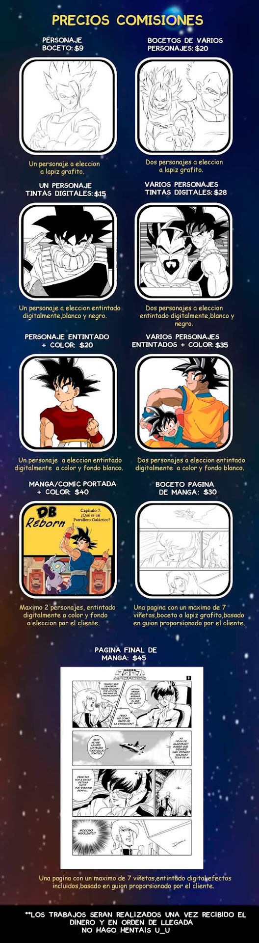 A todos los seguidores de DBEX le informamos que Rogeru actualmente está aceptando comisiones(dibujos por encargo). Aquí están los precios dependiendo del tipo de comisión que deseen.